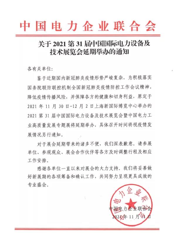 通知!通知!通知!重要的事情說三遍,“ 2021上海國際電力電工展 ” 延期舉辦