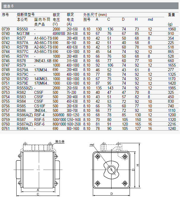 由純銀片制成的變截面熔體封裝于由高強(qiáng)度瓷制成的熔管內(nèi);熔管中充滿經(jīng)化學(xué)處理過的高純度石英砂作為滅弧介質(zhì);熔體二端采用點(diǎn)焊與觸頭牢固電連接。熔斷體型式有方管刀形觸頭和方管平板形觸頭兩種。熔斷體可帶指示器或撞擊器,當(dāng)熔體熔