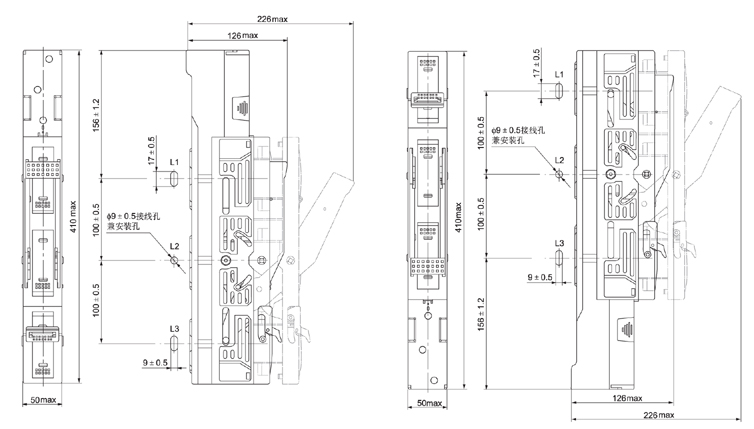 b、開關(guān)安裝方式:開關(guān)實(shí)施模塊化設(shè)計(jì)。MRO.H2(DR2)-160寬度為50mm,利用開關(guān)的進(jìn)線直接安裝在100mm母排系統(tǒng)上,分上出線或下出線兩種型式,三相同時(shí)分合,可以配裝尺碼為000或00任一種熔斷體;