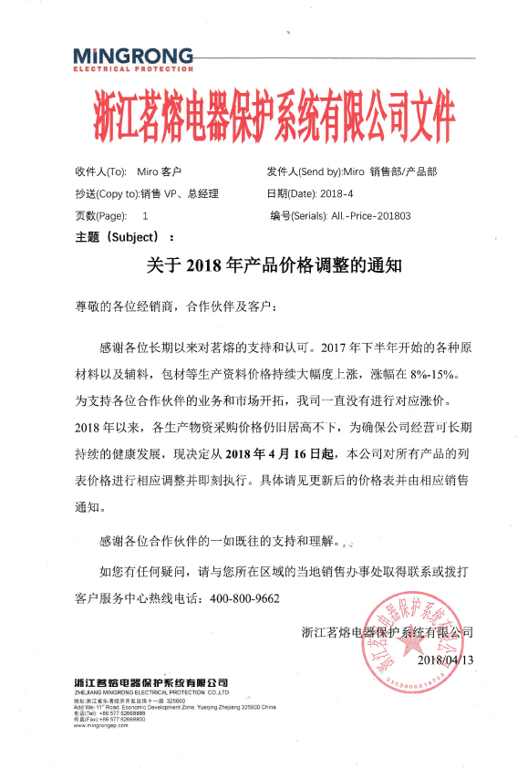 關(guān)于調(diào)整浙江茗熔電器保護(hù)系統(tǒng)有限公司產(chǎn)品售價的通知